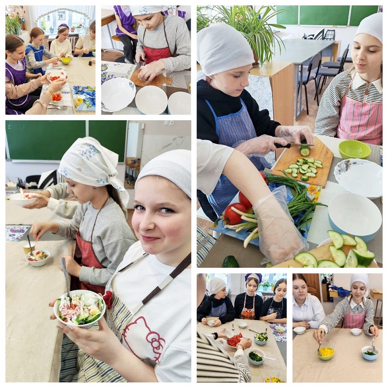 А наши талантливые семиклассницы погрузились в мир свежих овощей и ярких вкусов! Прошёл захватывающий мастер-класс «Салаты с изюминкой», где девочки готовили овощные салаты.