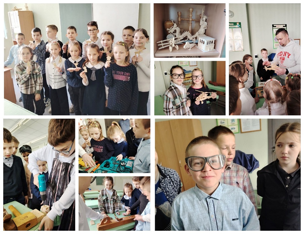 Ребята из 3 и 4 классов узнали о назначении различных инструментов, а также увидели, как из простых материалов могут получиться удивительные вещи. Мальчишки с восторгом пробовали работать с деревом под чутким руководством учителя Кирилла Николаевича Луцевича.